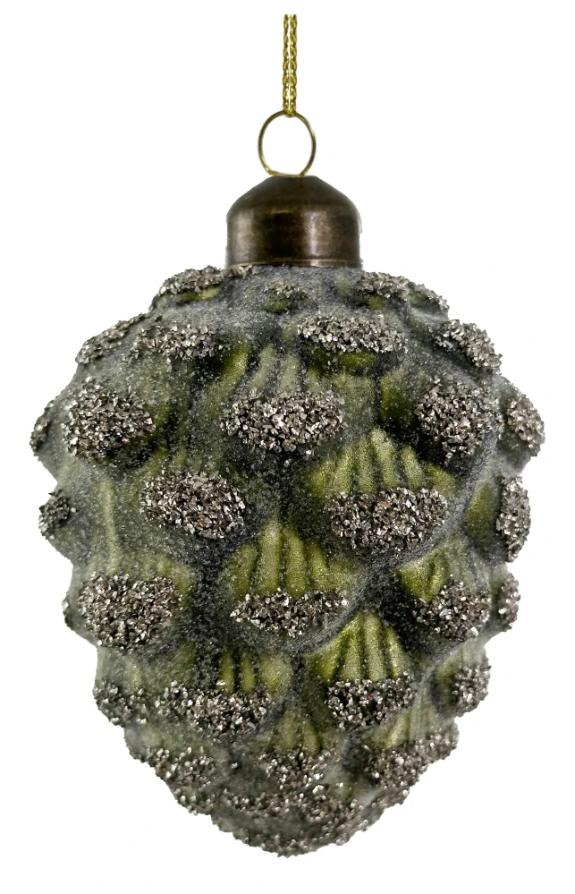 - A - Vánoční ozdoba, Skleněný kornout s cukrovou zelenou barvou a stříbrnými třpytkami 10 cm